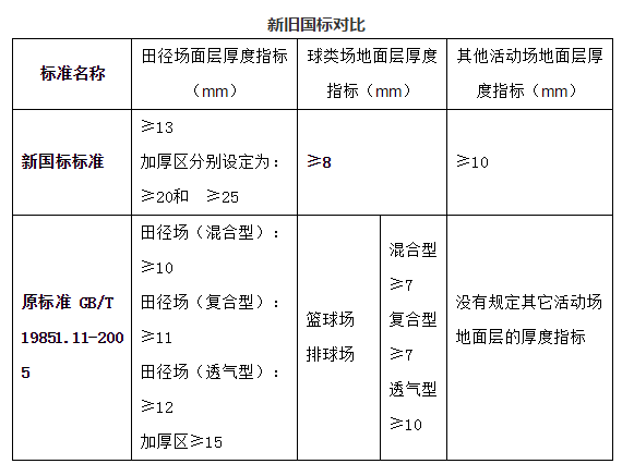 相比現(xiàn)行國標(biāo)《中小學(xué)體育器材和場地 第11部分:合成材料面層運動場地》GB/T 19851.11-2005,新修訂的強(qiáng)制性國標(biāo)主要有以下13大變化: