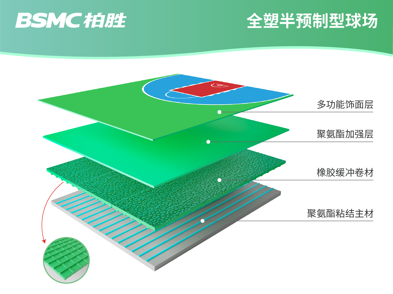 BSMC柏勝全塑半預(yù)制型球場系列產(chǎn)品,通過工廠預(yù)制聚氨酯緩沖片材和現(xiàn)澆面層相結(jié)合,同時(shí)擁有預(yù)制型的“性能均一” 和現(xiàn)澆型的“無縫耐用” ,保障現(xiàn)場100%的質(zhì)量,性能穩(wěn)定,更專業(yè)、更環(huán)保、更耐用。