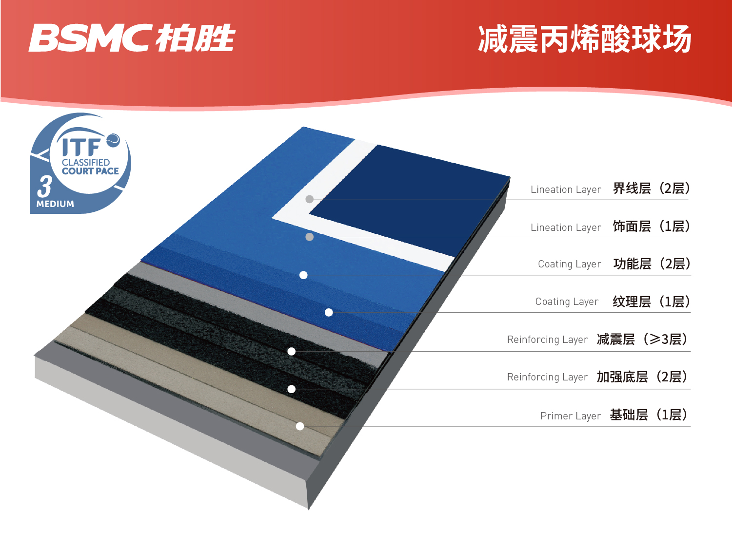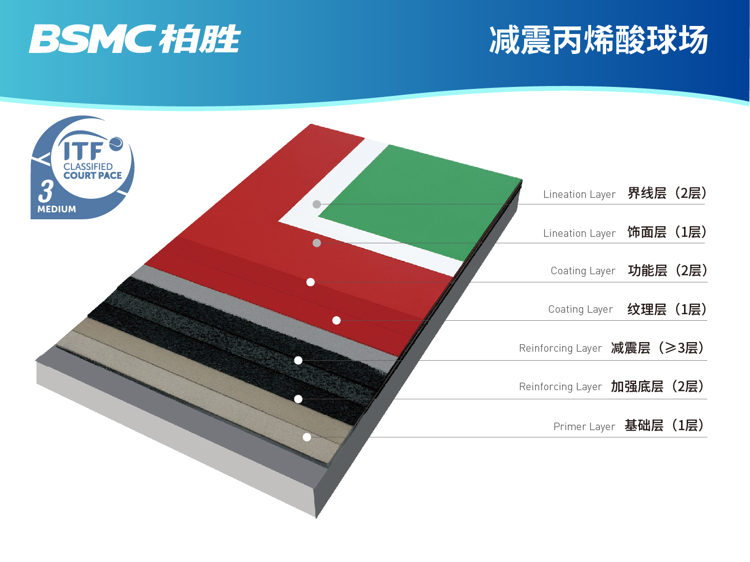 “BSMC柏勝”減震型丙烯酸球場(chǎng)的面層能有效舒緩沖力,降低對(duì)運(yùn)動(dòng)員的傷害及疲勞,在各種競(jìng)技比賽場(chǎng)地廣泛應(yīng)用。