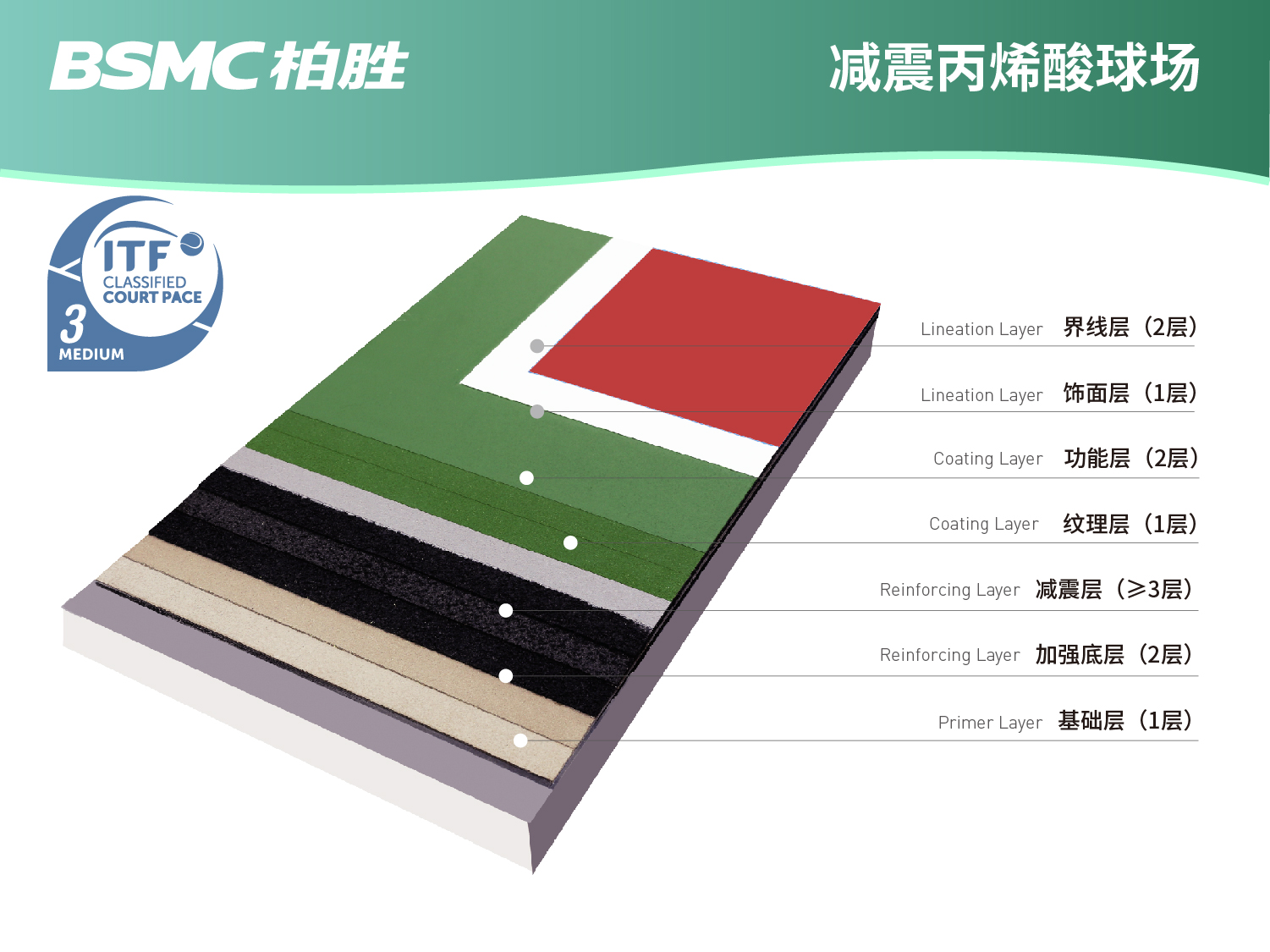 “BSMC柏勝”減震型丙烯酸球場(chǎng)主要由丙烯酸樹脂組成,是水性生態(tài)環(huán)保產(chǎn)品,通過國(guó)際網(wǎng)球協(xié)會(huì)(ITF)產(chǎn)品認(rèn)證。
