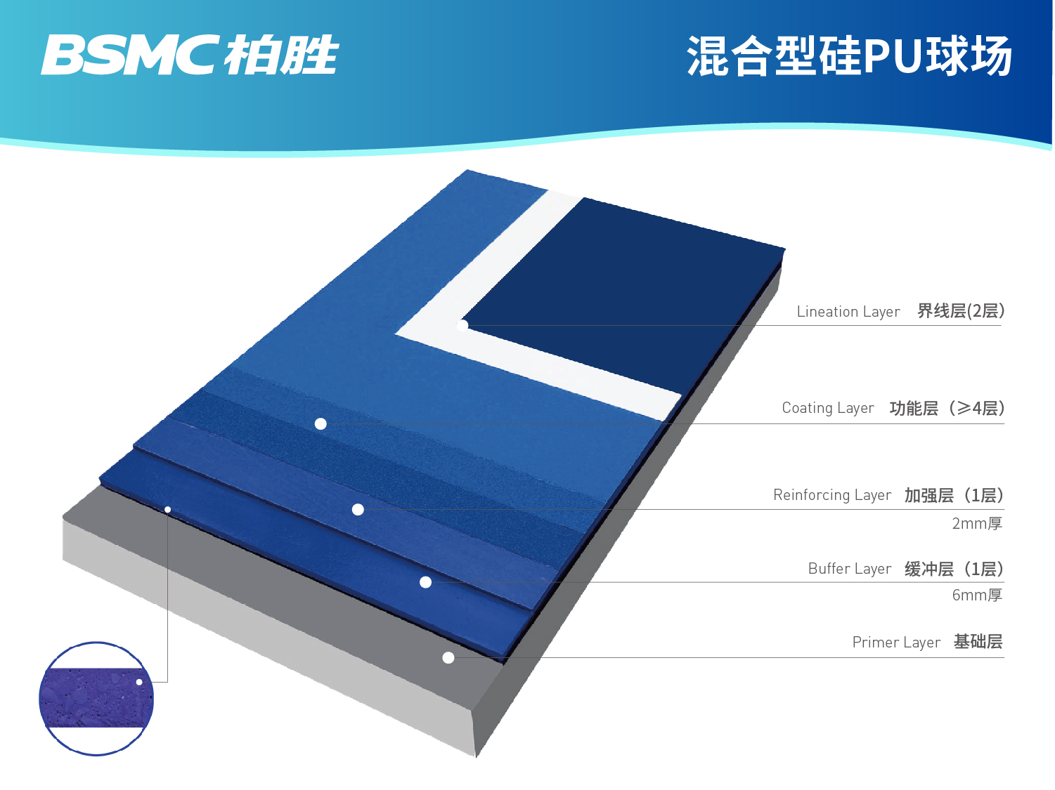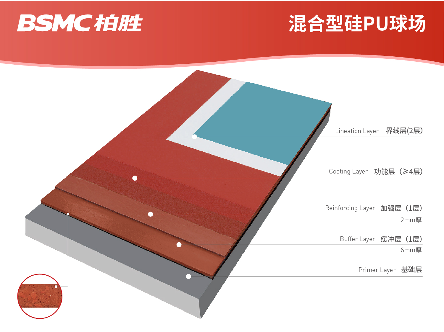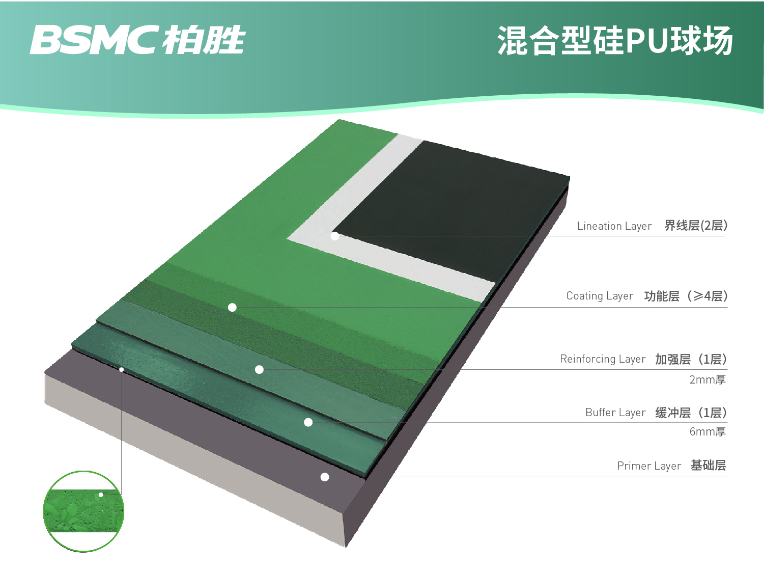 “BSMC柏勝”領(lǐng)創(chuàng)混合型硅PU球場(chǎng)具備“上硬下彈”結(jié)構(gòu)特征和“上水下油”獨(dú)特的環(huán)保特性,是能直接在水泥混凝土基礎(chǔ)或?yàn)r青混凝土基礎(chǔ)上施工的全天候室內(nèi)外運(yùn)動(dòng)場(chǎng)地合成面層系統(tǒng)。