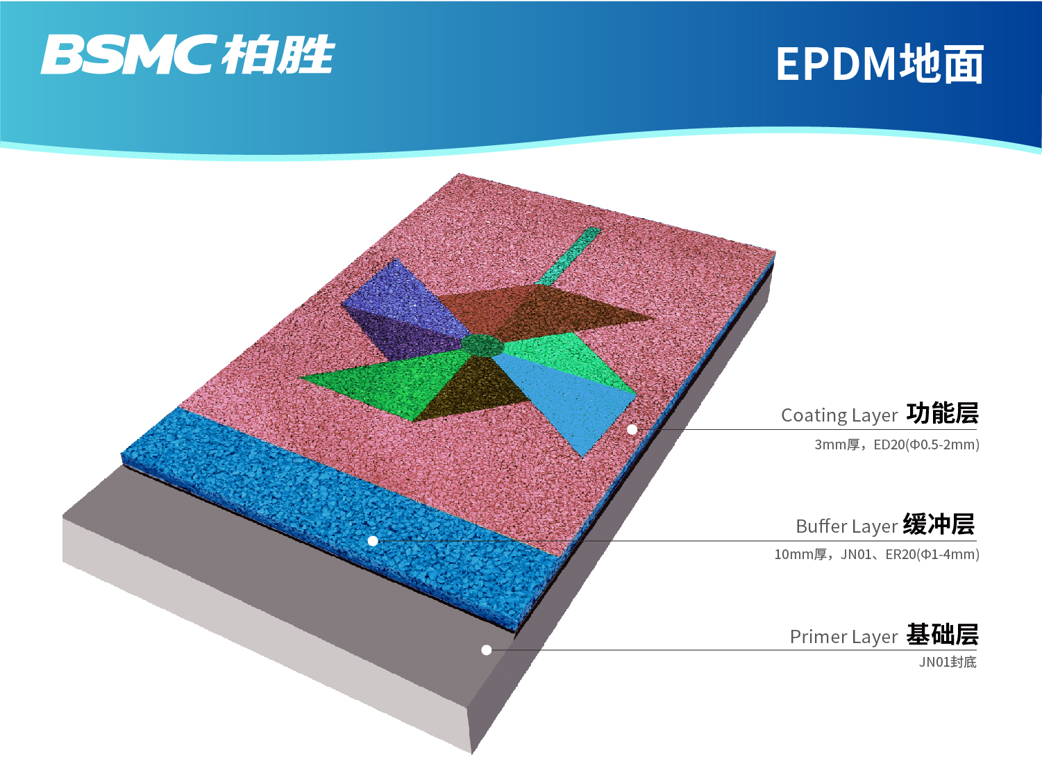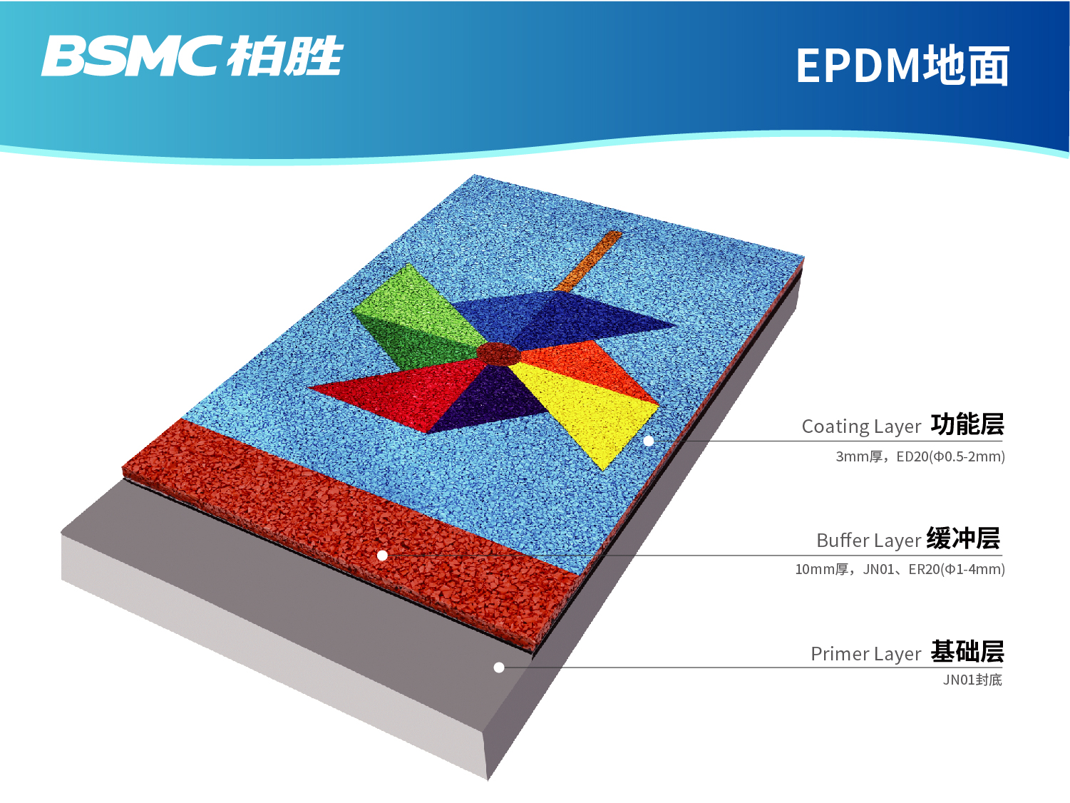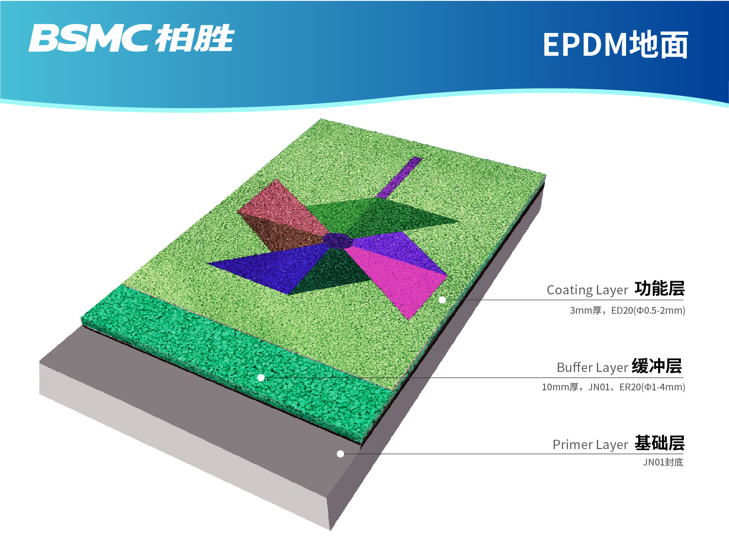 BSMC柏勝EPDM地面由彩色EPDM顆?;旌夏z粘劑(JN01)攤鋪而成,可設(shè)計(jì)成五彩繽紛的圖案,美觀耐久,即使在烈日爆曬下,亦不會(huì)褪色。EPDM橡膠顆粒主要成分三元乙丙橡膠、碳酸鈣、橡膠 軟化油和色粉等,其具有優(yōu)異的抗紫外線照射和耐老化性能,且顏色豐富多樣,可根據(jù)場(chǎng)地選擇搭配,優(yōu)異的性能使其全面適配跑道、緩步徑、拍面等面層要求。