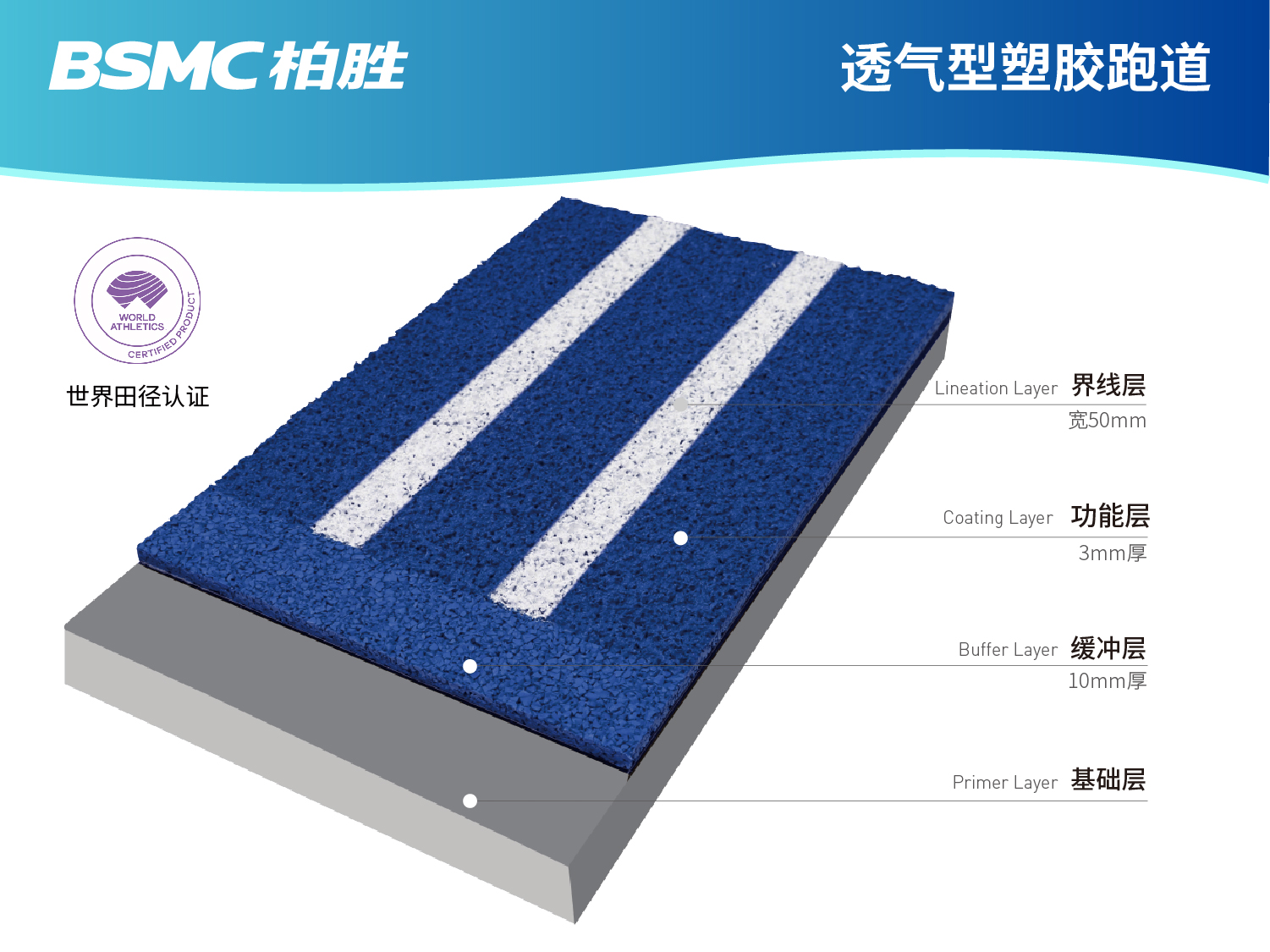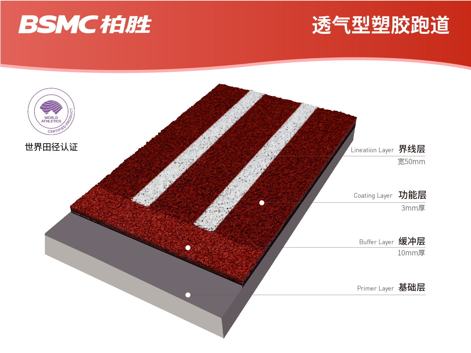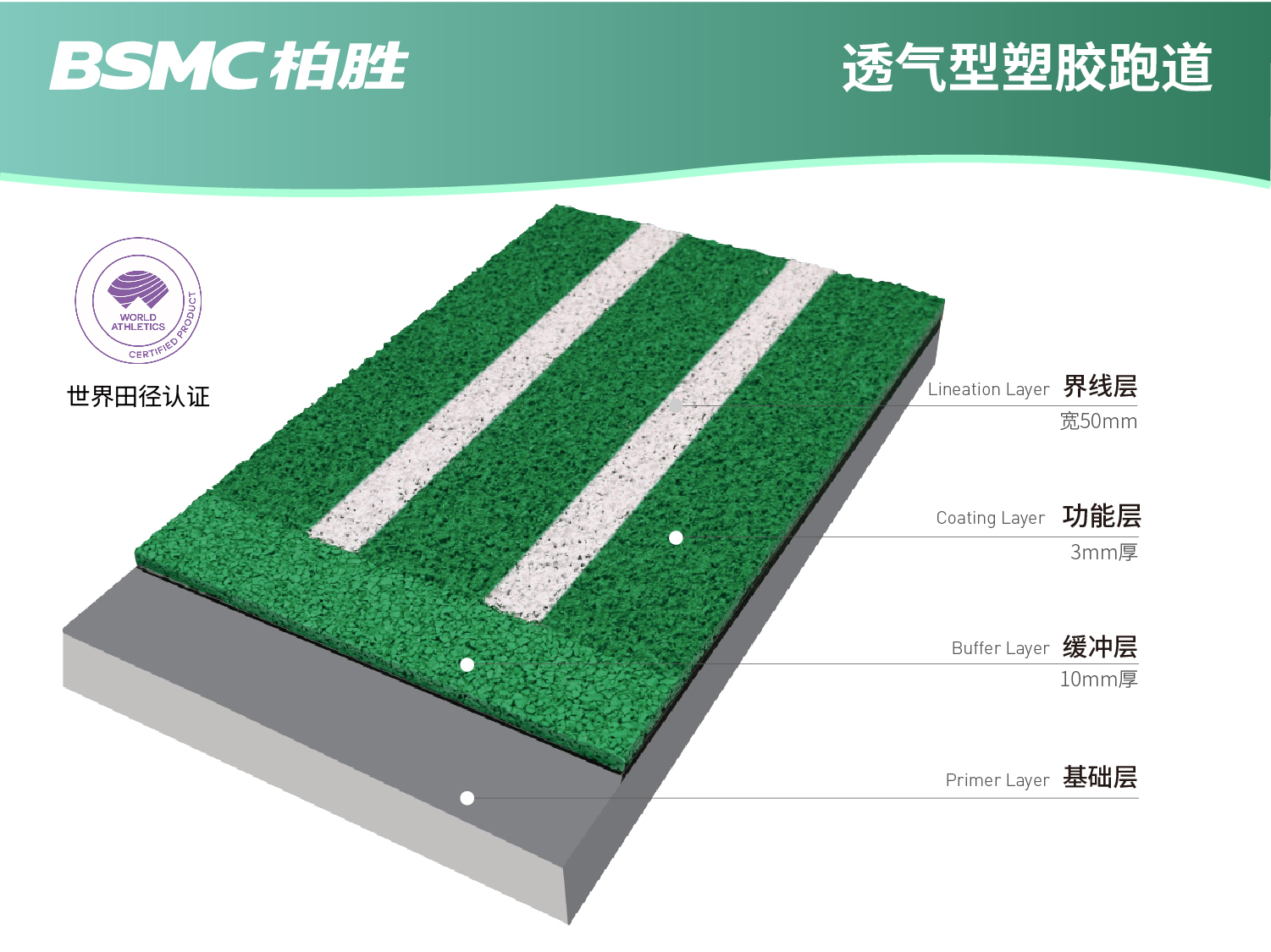 “BSMC柏勝”經(jīng)典透氣型跑道具有不鼓泡,不掉粒,不褪色,不積水的特性,并通過世界田聯(lián)、中國(guó)田徑協(xié)會(huì)產(chǎn)品認(rèn)證,符合田徑運(yùn)動(dòng)要求,有助于運(yùn)動(dòng)員發(fā)揮或提升成績(jī)。
